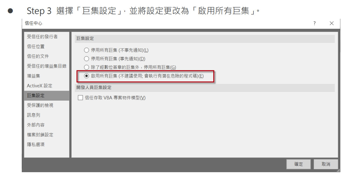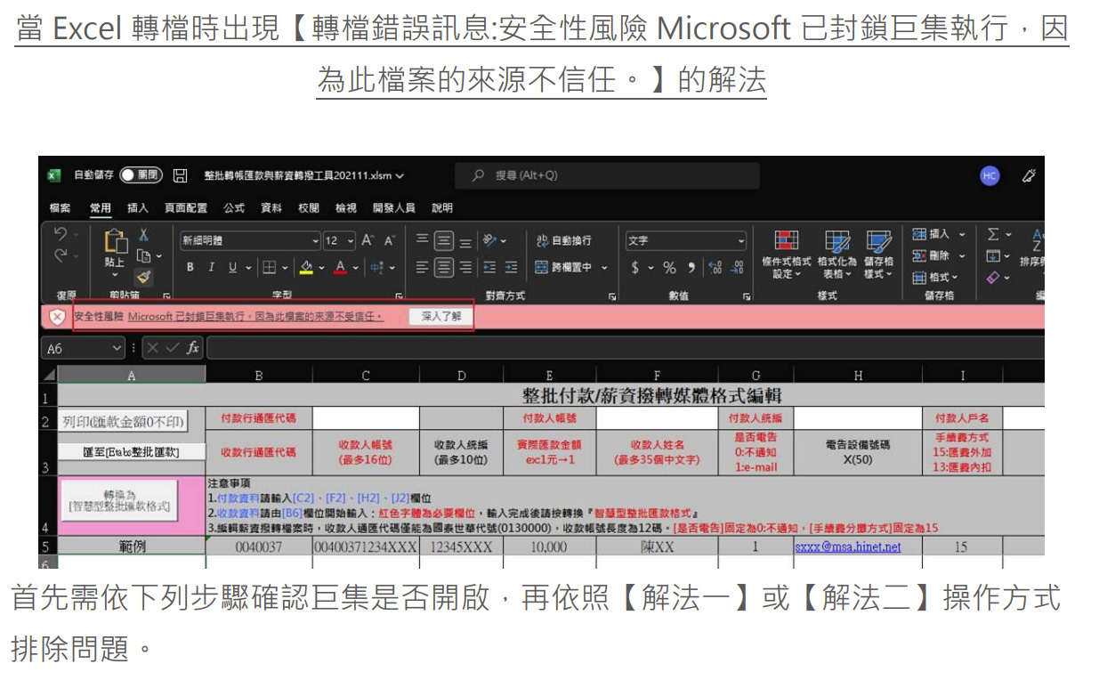 出現封鎖巨集的兩種解法bengo的馬後炮回測Nov 12, 2025Share由於我最近新做的小工具「排名檢視表」EXCEL檔內有巨集,而部分訂閱戶下載後會出現封鎖巨集的訊息,以下有兩種解法可以試試看。